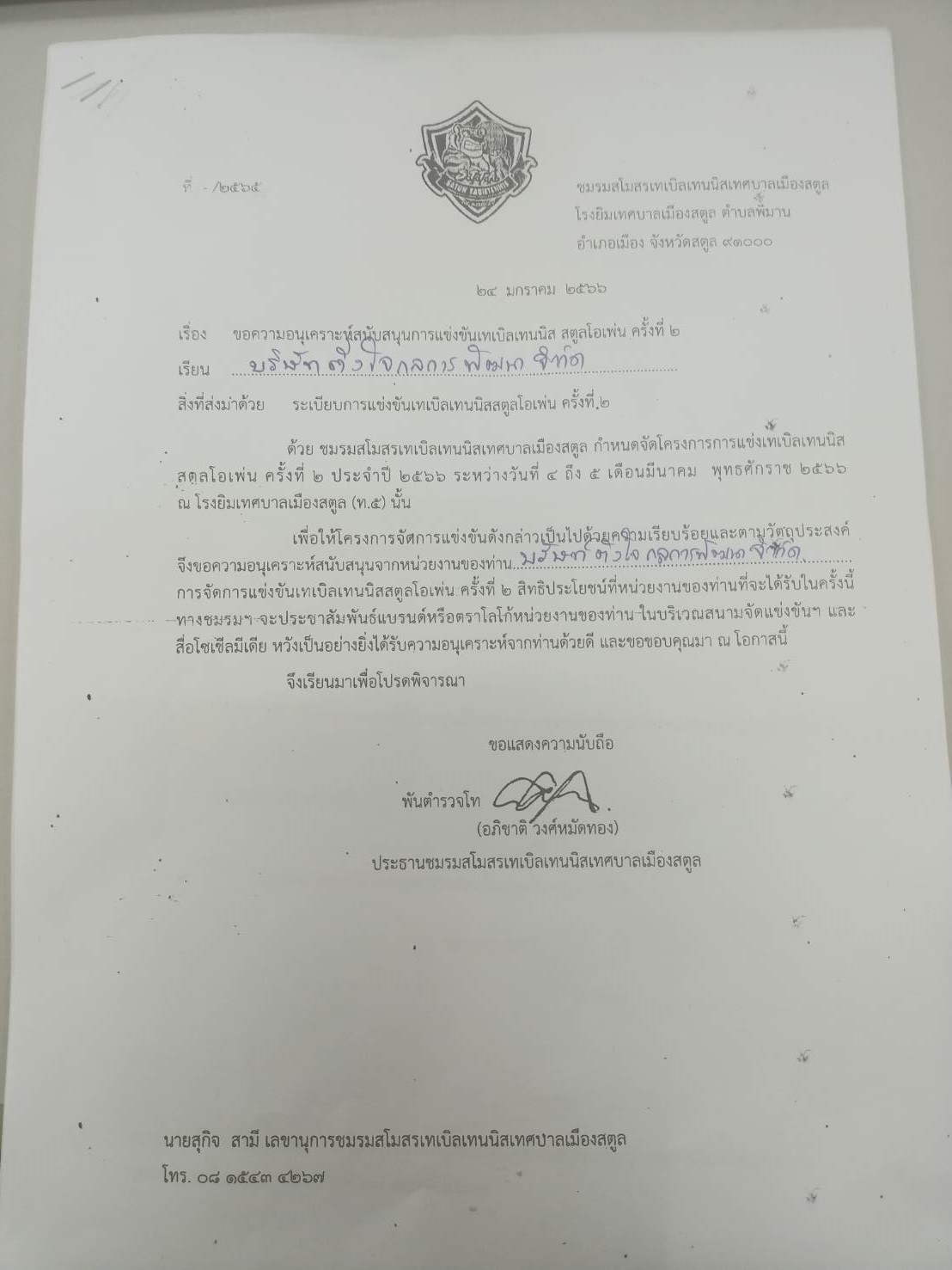 | 24 ก.พ. 2566 เวลา 02:32 No. 202302020 | ลูกค้าสัมพันธ์ | 105-ตจ.สตูล 1 | ขอสนับสนุนการแข่งขันเทเบิลเทนนิส ชมรมสโมสรเทเบิลเทนนิสเทศบาลเมืองสตูล ไฟล์แนบ 1: | วีรพล แก้วเกื้อกูล หัวหน้าฝ่ายการตลาด | สำเร็จ | ||