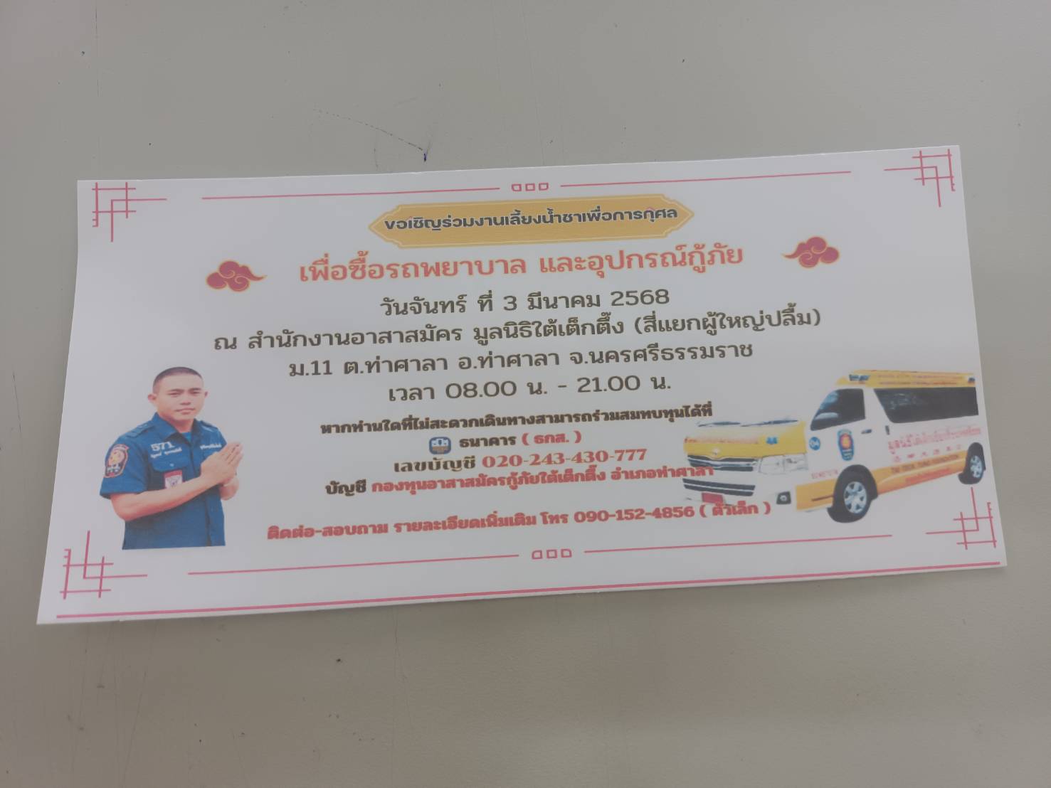 | 18 ก.พ. 2568 เวลา 05:57 No. 202502010 | ลูกค้าสัมพันธ์ | 403-ตจ.กลการท่าศาลา 1 | ขอสบทบทุนงานเลี้ยงน้ำชาเพื่อการกุศล ณ สำนักงานอาสาสมัคร มูลนิธิใต้เต็กตึ๊ง อำเภอท่าศาลา ไฟล์แนบ 1: | จัดส่งงบประมาณตามรอบเอกสารน่ะครับ | พัฒพงษ์ ชูยัง เจ้าหน้าที่ลูกค้าสัมพันธ์ | สำเร็จ | |