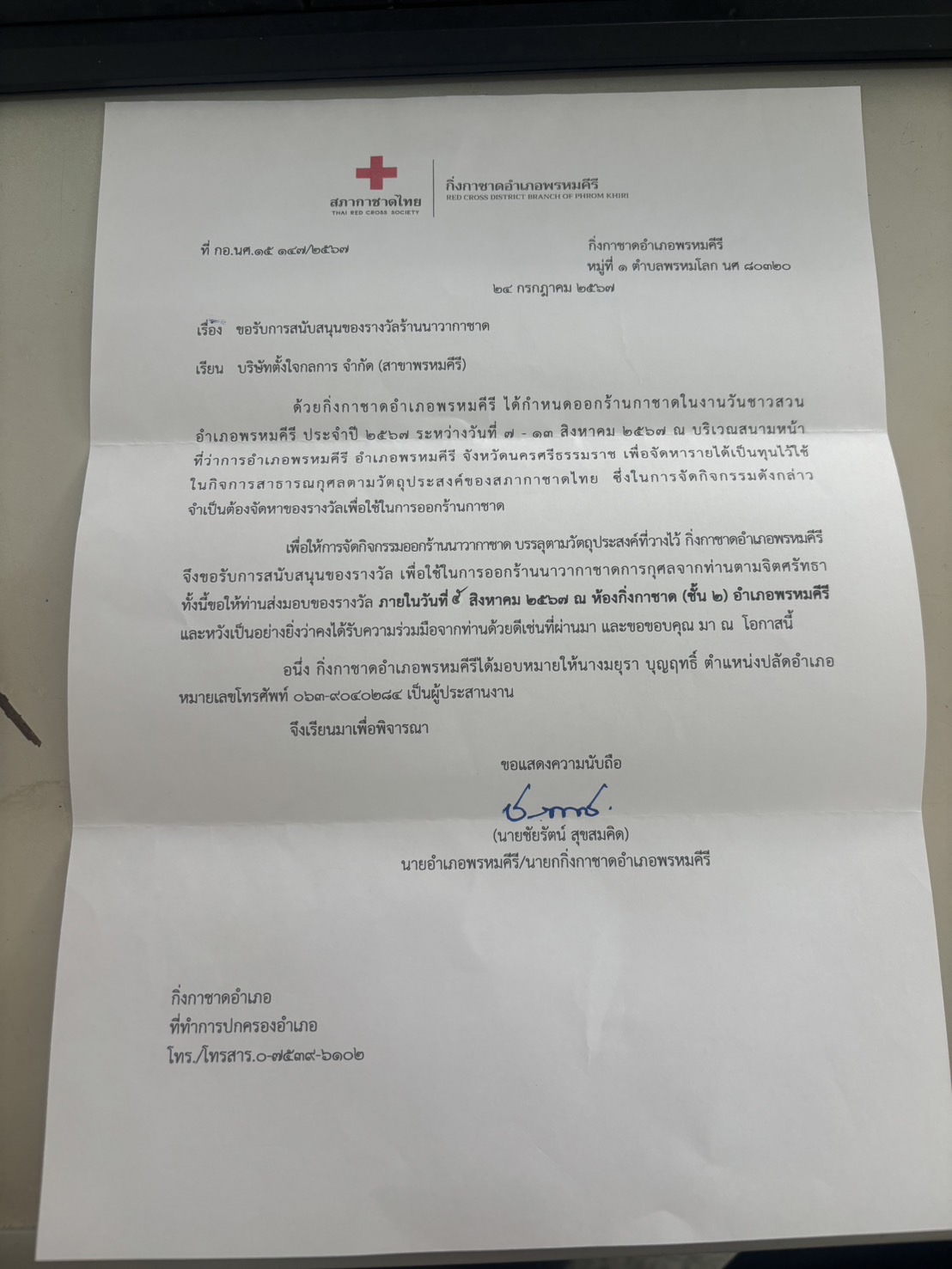 | 05 ส.ค. 2567 เวลา 05:22 No. 202408003 | ประชาสัมพันธ์ | 409-ตจ.กลการพรหมคีรี | ขอสนับสนุนของรางวัลร้านนาวากาชาด อำเภอพรหมคีรี ไฟล์แนบ 1: | พัฒพงษ์ ชูยัง เจ้าหน้าที่ลูกค้าสัมพันธ์ | ยกเลิก | ||