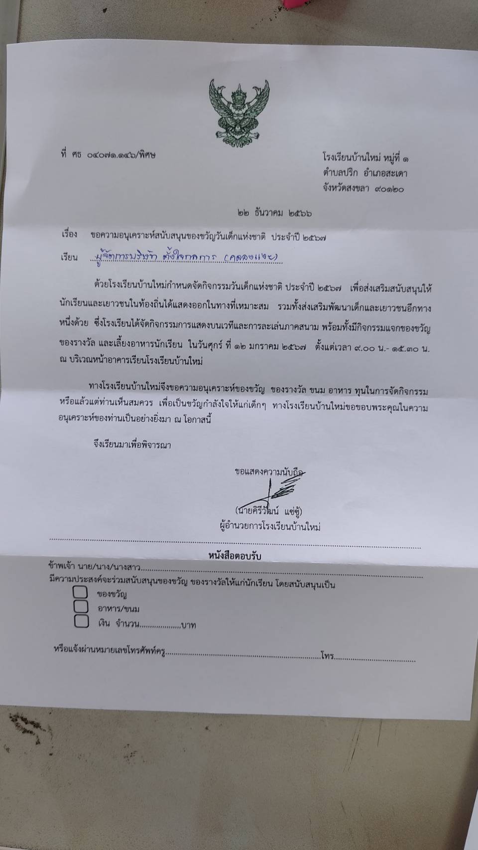 | 04 ม.ค. 2567 เวลา 09:26 No. 202401022 | ประชาสัมพันธ์ | 115-ตจ.ลาหงา | ขอความอนุุเคราะห์ของขวัญวันเด็กประจำปี 2567 โรงเรียนบ้านหนองหอยโข่ง ไฟล์แนบ 1: | เนื่องจากทางฝ่ายการตลาดจัดซื้อของขวัญและเตรียมจัดส่งเรียบร้อยแล้ว | วีรพล แก้วเกื้อกูล หัวหน้าฝ่ายการตลาด | ยกเลิก | |