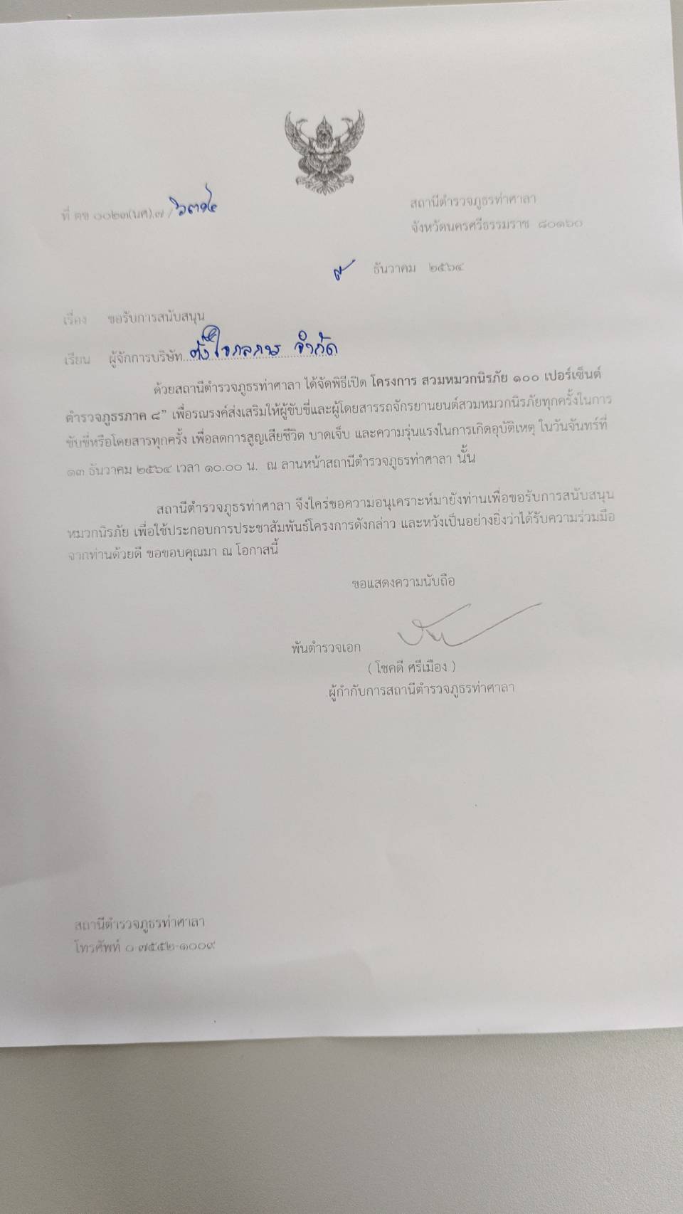| 09 ธ.ค. 2564 เวลา 09:03 No. 202112007 | ลูกค้าสัมพันธ์ | 403-ตจ.กลการท่าศาลา 1 | สถานีตำรวจภูธรท่าศาลา จัดโครงสวมหมวกนิรภัย 100 เปอร์เซ็น จึงขอความอนุเคราห์ ขอหมวกกันน็อคนิรภัย ไฟล์แนบ 1: | วีรพล แก้วเกื้อกูล หัวหน้าฝ่ายการตลาด | สำเร็จ | ||