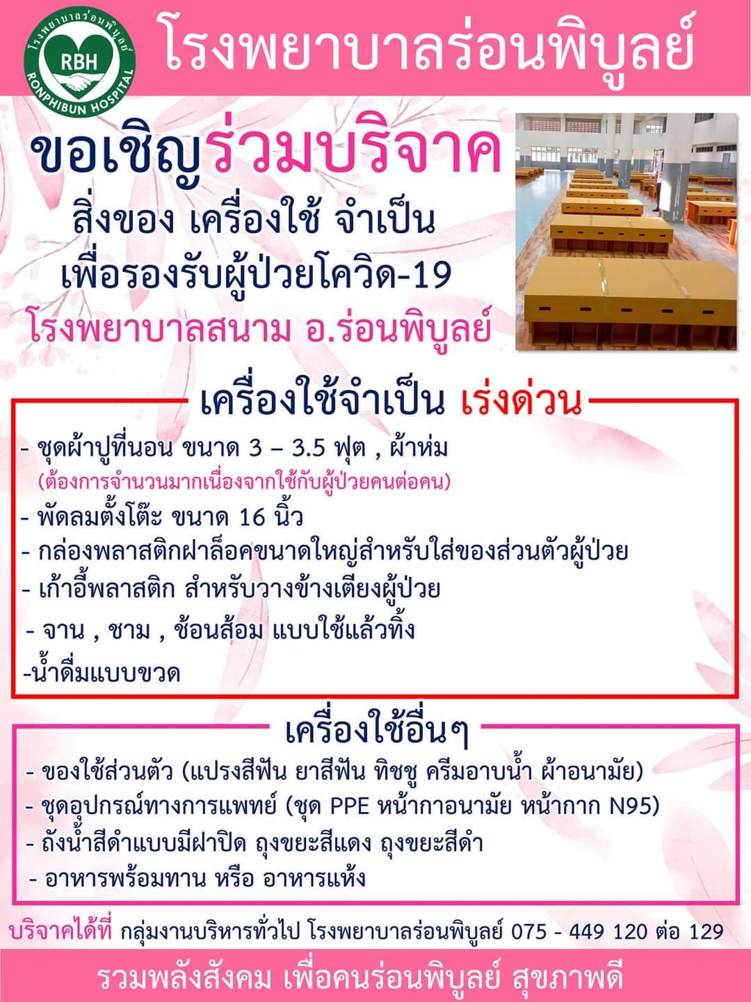 | 21 ก.ค. 2564 เวลา 14:02 No. 202107013 | ส่งเสริมการขาย | 107-ตจ.ร่อนพิบูลย์ 2 | โรงพยาบาลร่อนพิบูลย์ขอความชวยเหลือร่วมบริจาคสิ่งของที่จำเป็นสำหรับโรงพยาบาลสนามที่มาเปิดเพิ่ม ไฟล์แนบ 1: | วีรพล แก้วเกื้อกูล หัวหน้าฝ่ายการตลาด | สำเร็จ | ||